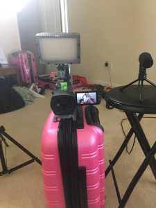 Here’s the picture too that we talked about of the behind the scenes “tripod” setup and you can see the light thing on top of the camcorder, that’s the piece that broke off one time going up the stairs and could have landed right on my face!! ๐ lol